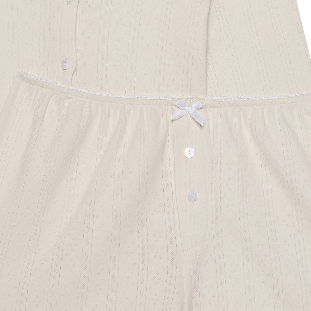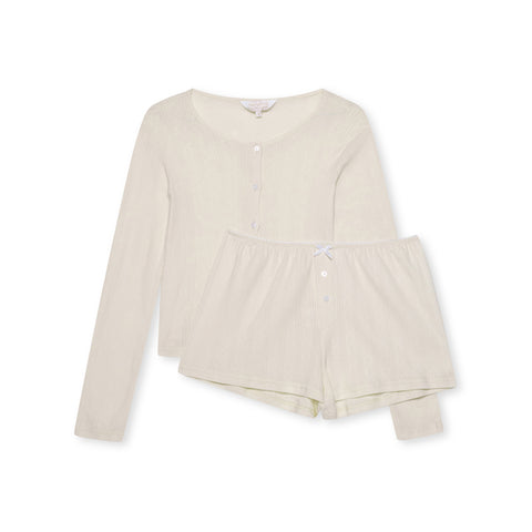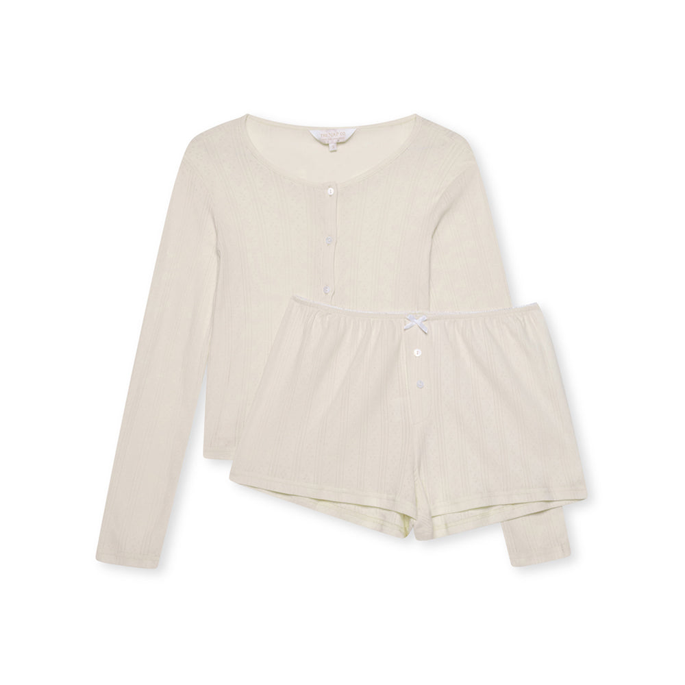 This cosy and chic pointelle PJ set is made from a quality 100% pure cotton for long-lasting softness. The cardigan is long-sleeved, fitted and has a front button closure design. Paired with our cool girl, elasticated waist band matching short finished with three mini centre buttons. Mix and match with our pointelle bra or soft sleep crop for endless elevated home fits.